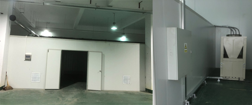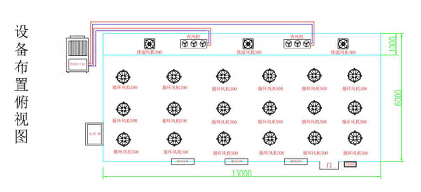 超濾膜絲熱泵干燥裝置,用一臺20P熱泵烘干機,對烘房吹熱風,配置兩臺內風機,18臺擾流風機,兩臺排濕風機,整體構成了烘干系統,來滿足150平方烘房恒溫40-45度。
