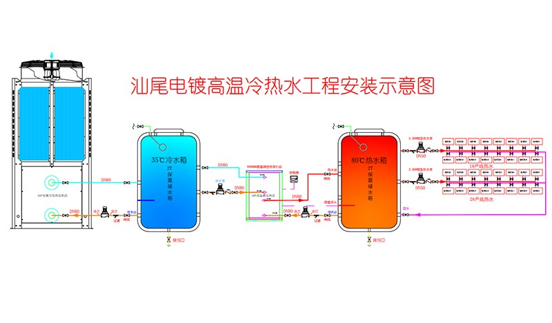 該項目為廣東汕尾電鍍廠加熱恒溫系統(tǒng),要求加熱溫度80度,設(shè)計采用分體式復(fù)疊(雙級耦合)高溫?zé)岜?/strong>加熱系統(tǒng)。一級配置一臺50匹空氣源熱泵機組和一只2噸的保溫低溫水箱,將水箱溫度維持在35-40度。二級配置一臺50匹高溫水源熱泵機組和一只2噸的保溫高溫水箱,將水箱溫度維持在80-85度。空氣源熱泵加熱的低溫水箱作為高溫水源熱泵的熱源,加熱2噸高溫水箱。達到大化的節(jié)能效果。