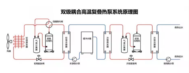 復(fù)疊式熱泵循環(huán)是將較大的總溫差分割成兩段或若干段,根據(jù)每段的溫區(qū)選擇適宜的制冷劑循環(huán),然后將它們疊加起來,用低溫級的冷凝熱來供應(yīng)高溫級的蒸發(fā)負荷,從而使得高溫級獲取較高冷凝溫度的方式;以兩級復(fù)疊式熱泵循環(huán)為例,它由高溫級和低溫級兩部分組成,高溫級使用中溫制冷劑,低溫級使用低溫制冷劑,形成兩個單級壓縮熱泵系統(tǒng)復(fù)疊工作的循環(huán)。兩級系統(tǒng)之間采用冷凝蒸發(fā)器銜接起來,高溫級的制冷劑在其中蒸發(fā)吸熱,低溫級制冷劑在其中冷凝放熱。從冷凝蒸發(fā)器出來的中溫制冷劑蒸氣帶走低溫制冷劑的冷凝熱量,經(jīng)過高溫級制冷循環(huán)將熱量傳遞給循環(huán)熱水,實現(xiàn)高溫度熱水。而從冷凝蒸發(fā)器出來的低溫制冷劑液體,經(jīng)低溫級節(jié)流閥降壓后,進入蒸發(fā)器吸取外界環(huán)境中的熱泵量,從而實現(xiàn)低環(huán)境溫度下的運行。低溫級采用直流變頻壓縮機,變動頻率可達30-120Hz,可適應(yīng)環(huán)溫在—35℃-45℃的工況運行。蒸發(fā)風(fēng)機及冷凝水泵采用變頻控制,可解決高環(huán)溫低水溫等狀態(tài)下的小壓比帶來的壓縮機風(fēng)險,保障系統(tǒng)在各種復(fù)雜工況下的穩(wěn)定運行。在氟路系統(tǒng)、采用高低壓傳感器時時監(jiān)控冷凝壓力及蒸發(fā)壓力,通過邏輯運算控制膨脹閥的開度,較大化的提升了系統(tǒng)運行效率。