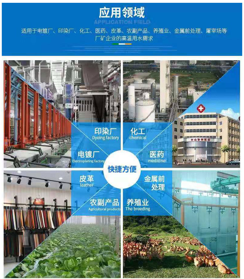 產(chǎn)品適用范圍:廣泛應(yīng)用于各類屠宰廠、電鍍廠、電子廠、牛奶廠、日化廠、洗滌廠等企業(yè)熱水改造。