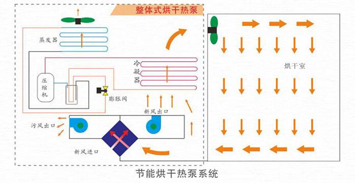 熱泵烘干利用蒸發(fā)器吸收外界空氣中的熱源,或者回收干燥過程中排氣的余熱,經(jīng)過壓縮機做工,將能量搬運(轉(zhuǎn)移)至烘干箱中,反復循環(huán)加熱,排濕、除水、實現(xiàn)烘干。熱泵干燥將降低消耗和提高產(chǎn)品質(zhì)量,高溫機組采用特殊工藝及特殊冷媒,使得壓縮機在保持良好工作狀態(tài)的條件下生產(chǎn)75℃~85℃熱水,熱效率仍大于2.5。